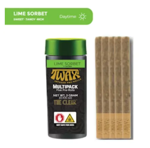 TWAX Infused Pre-roll 3g Multipack Lime Sorbet Daytime – Sweet, Tangy, Rich Experience a harmonious balance of flavors with our Lime Sorbet TWAX infused pre-roll. It starts with a sweet, tangy burst and finishes with a rich creaminess. This sativa-influenced profile is perfect for a powerful, giggly, social experience, making it ideal for your daytime needs. Each infused pre-roll contains one (3) gram of premium flower, infused with distillate and kief wrapped in dye-free, unbleached paper. We take pride in offering our consumers whole, premium flower infusion ensuring a slow and even burn, every time.