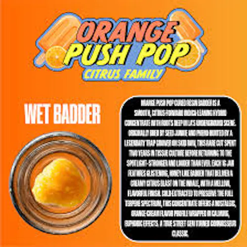 Orange Push Pop cured resin badder is a smooth, citrus-forward indica-leaning hybrid concentrate with roots deep in LA's underground scene. Originally bred by Seed Junkie and pheno-hunted by a legendary trap grower on Skid Row, this rare cut spent two years in tissue culture before returning to the spotlight -- stronger and louder than ever.